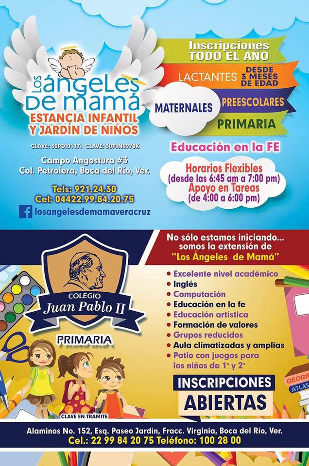 Estancia Infantil y Jardín de Niños “Los Ángeles de Mamá” Campo Angostura No. 3 Col. Heriberto Kehoe Vincent Boca del Rio, Veracruz Tel. 9212430 Cel. 2299-842075 Directora: Prof. Lizzetta del Carmen Sosa García.